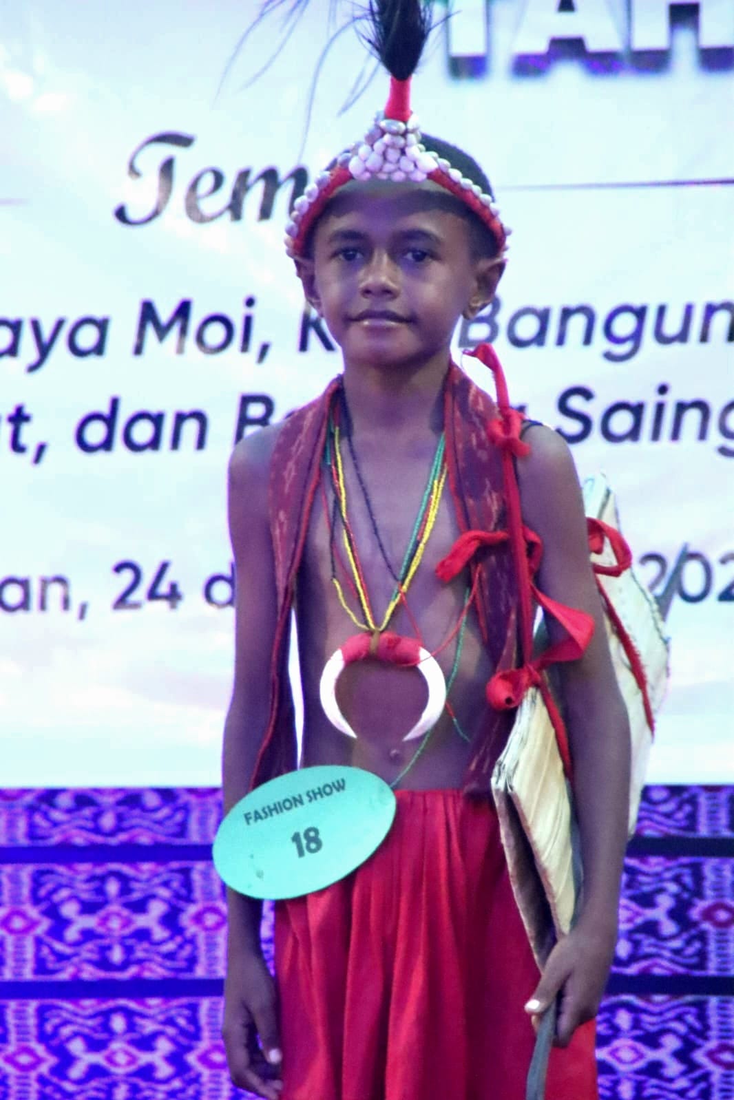 Dalam perlombaan tersebut, kategori anak putra berhasil dimenangkan oleh Jeremi Malibela, yang tampil percaya diri mengenakan busana adat khas Suku Moi.