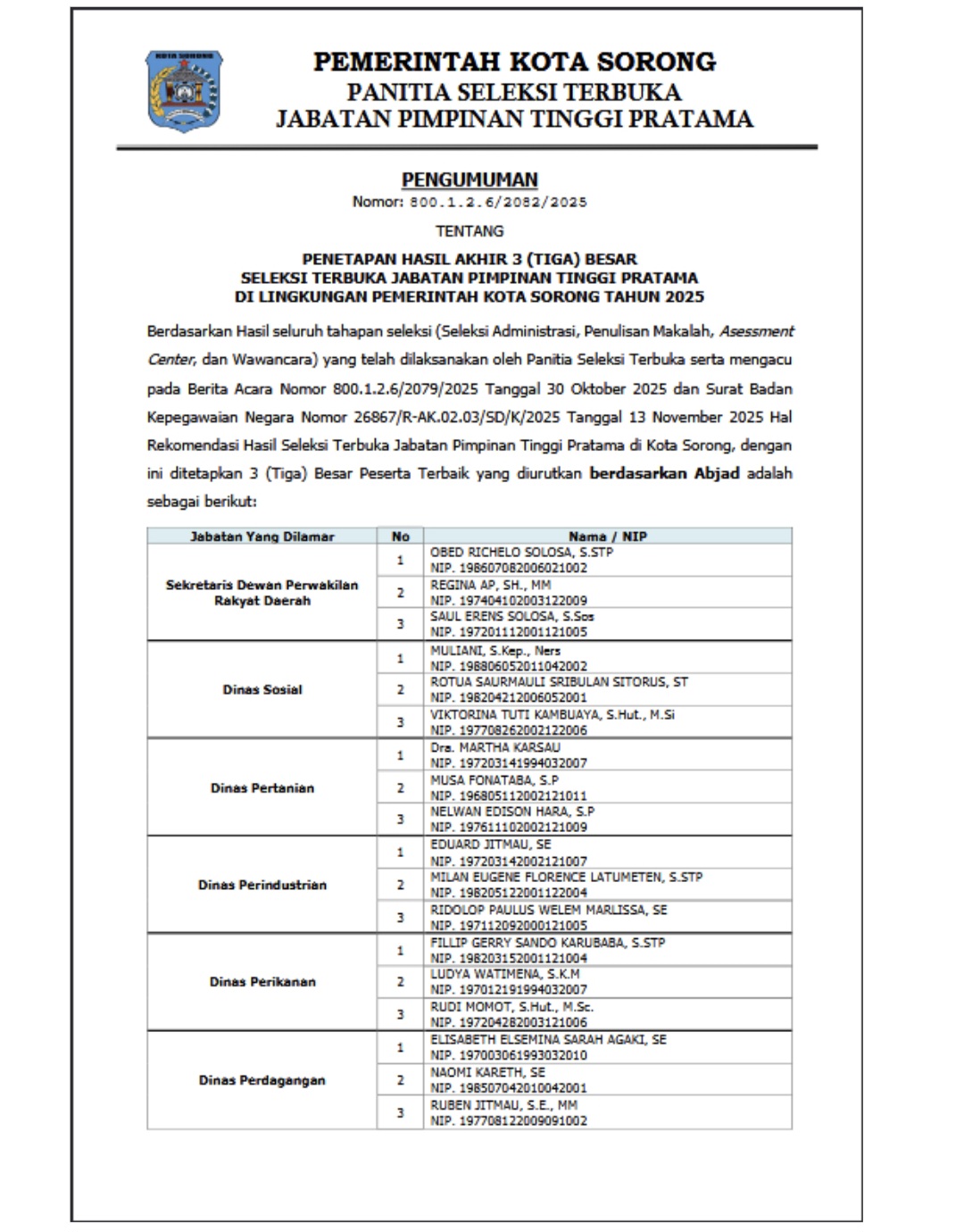 Penetapan juga mengacu pada Surat Badan Kepegawaian Negara (BKN) Nomor 26867/R-AK.02.03/SD/K/2025 tanggal 13 November 2025 tentang rekomendasi hasil seleksi terbuka JPT Pratama di Kota Sorong.