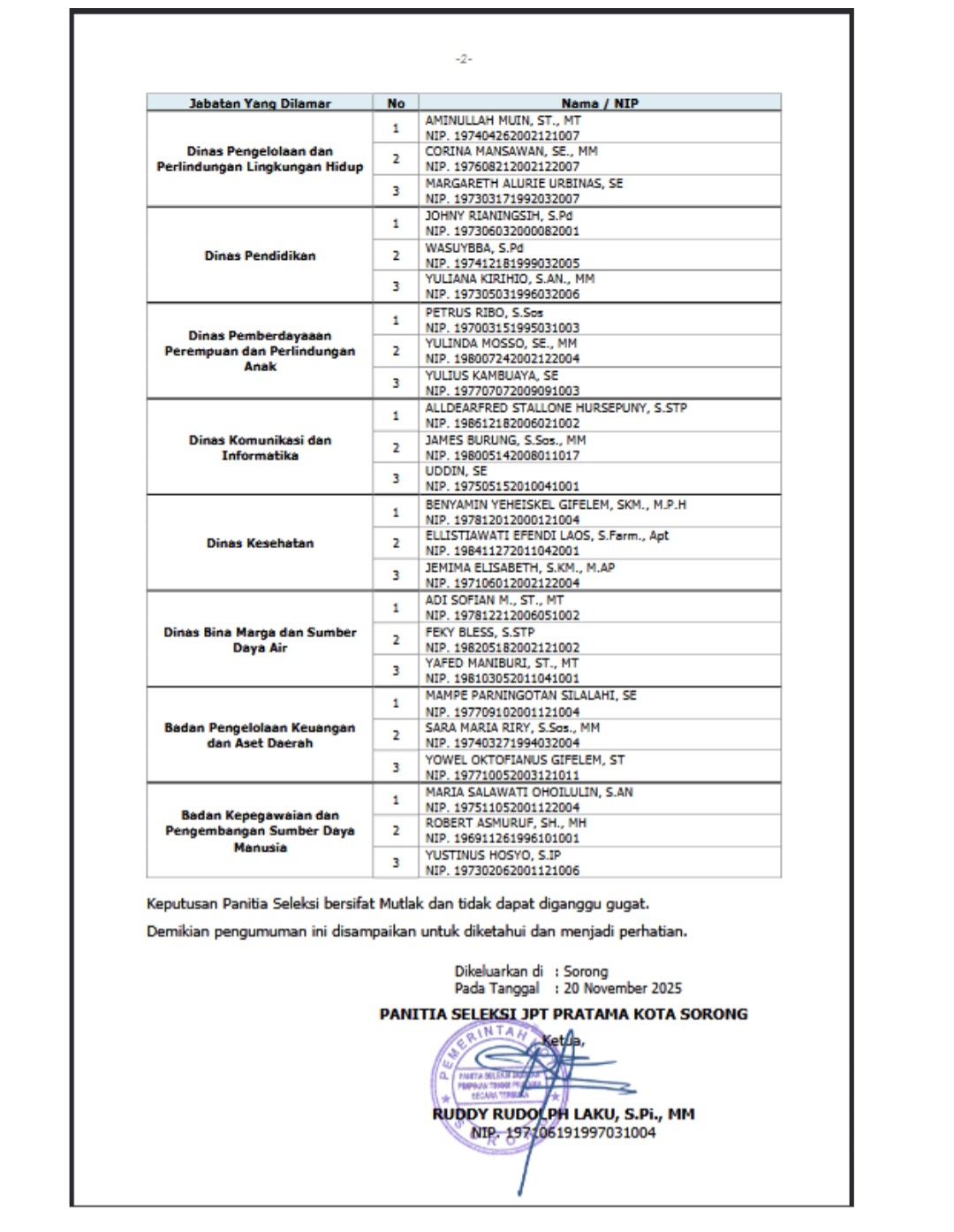 Hasil tersebut dituangkan dalam Berita Acara Pansel Nomor 800.1.2.6/2079/2025 tertanggal 30 Oktober 2025.